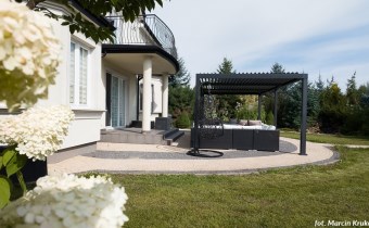 dom zbudowany wg projektu SOKÓŁ - classic - L dom z wykuszami TYP I, jednopiętrowy, niepodpiwniczony. Wykończony z wysokiej jakości materiałów z najwyższą starannością i dbałością o detale. Utrzymany w tradycyjnym stylu, ogrzewanie gazowe, na parterze ogrzewanie podłogowe, instalacja fotowoltaiczna, dach pokryty dachówką ceramiczną, wykonany z pustaka ceramicznego. Ogrodzona i zagospodarowana działka z licznymi nasadzeniami wykonana wg indywidulanego projektu, alarm, videodomofon, filtry wody, klimatyzacja. Istnieje możliwość dokupienia sąsiedniej działki.