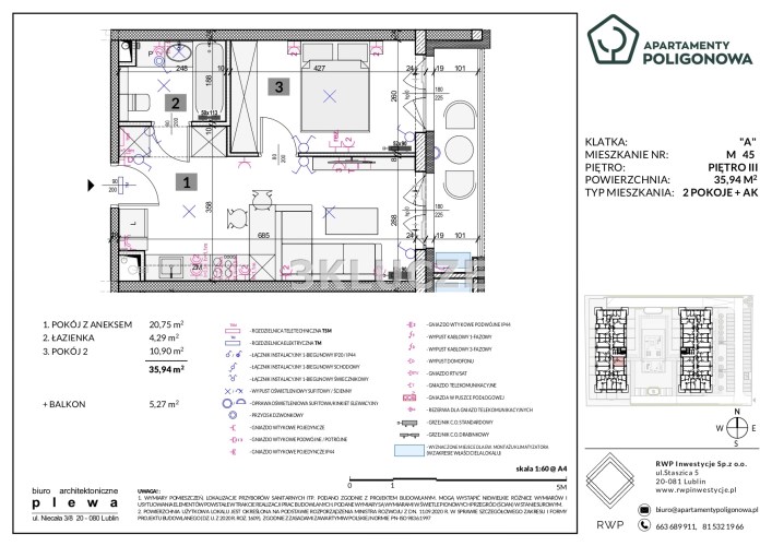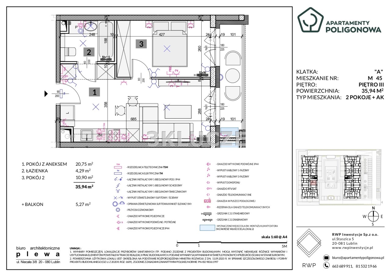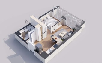 Dwupokojowe mieszkanie na III piętrze budynku w trakcie realizacji na Botaniku. Salon z aneksem kuchennym o pow. 20,75m2 z wyjściem na balkon. Sypialnia o pow. 10,9m2. Łazienka z WC 4,29m2.Wystawa okien: wschód.