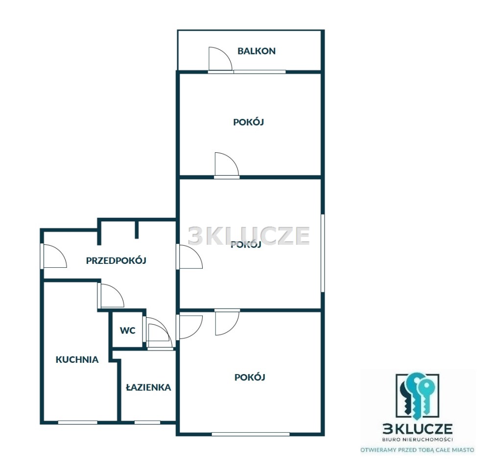 Mieszkanie składa się z 3 pokoi o powierzchni 14 m2, 12,20 m2 i 10,35 m2 (wyjście na balkon), osobnej kuchni, łazienki i WC.