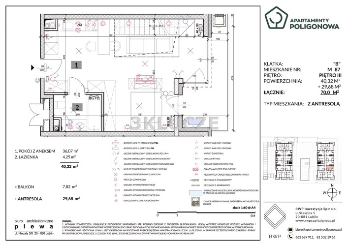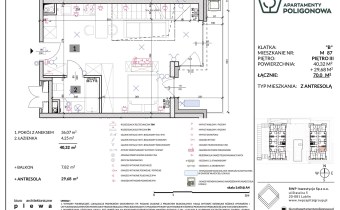 Mieszkanie z antresolą na III piętrze budynku w trakcie realizacji na Botaniku. Salon z aneksem kuchennym o pow. 36,07m2. Łazienka z WC 4,25m2. Antresola o pow. 29,68m2 z wyjściem na taras.Pow. dodatkowa ok. 11m2.
