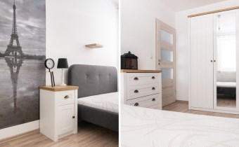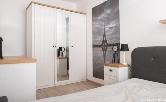 Aneks kuchenny połączony z salonem: zabudowa kuchenna, sprzęt AGD (lodówka, kuchenka, piekarnik), sypialnia, łazienka z wc (kabina prysznicowa, pralka), duży balkon.